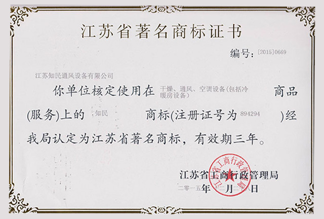 江苏省著名商标证书