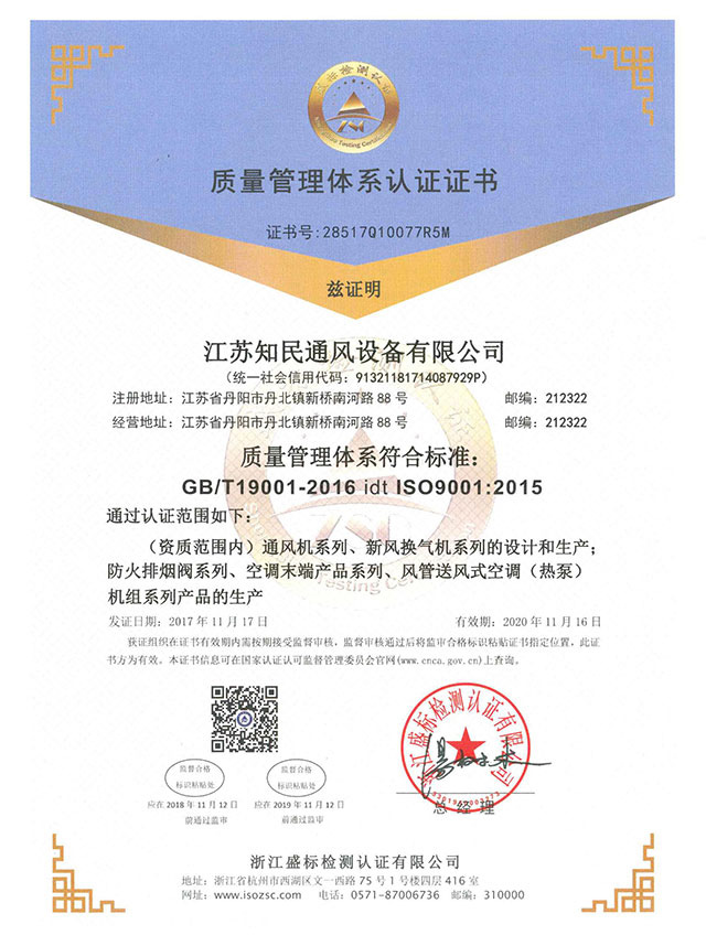 质量管理体系认证证书