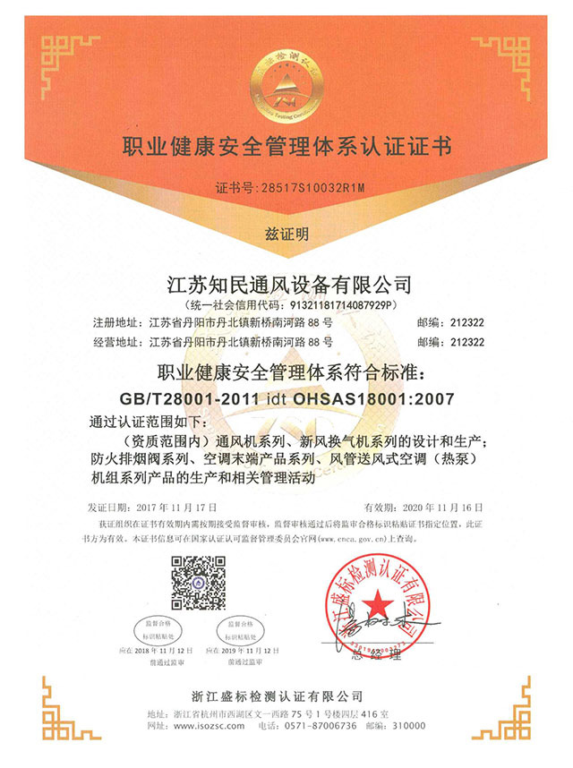 职业健康安全管理体系认证证书